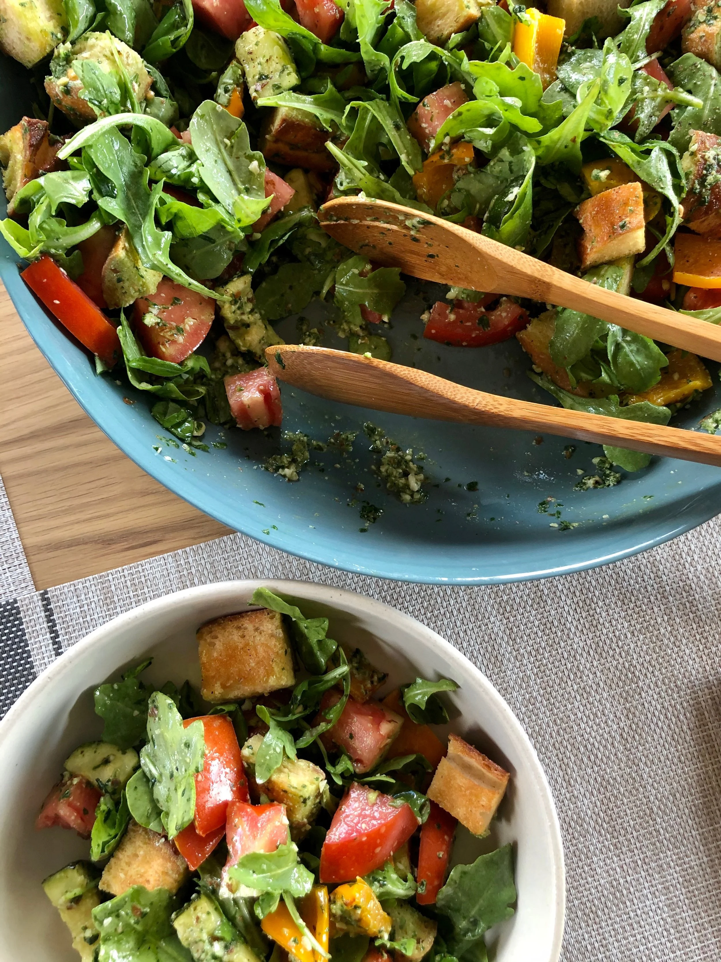 On a baking sheet, combine the bread, zucchini and bell pepper with ghee, salt and pepper. Place in the oven and cook for 20 to 25 minutes, stirring halfway through.