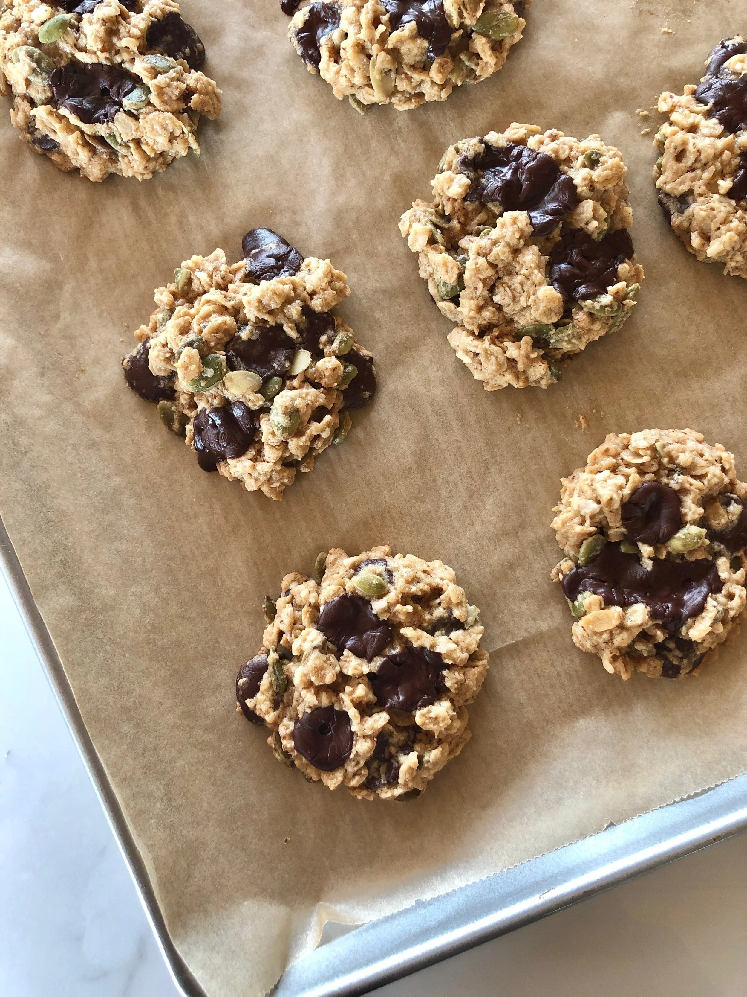 4. Fold in the chocolate chips, coconut and pumpkin seeds.